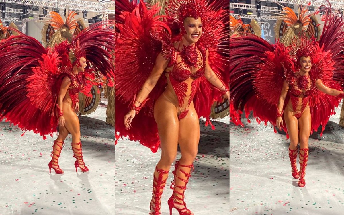 Durante a passagem pela avenida, o costeiro da fantasia, que pesava cerca de 12 quilos, precisou ser retirado após a influenciadora relatar dores. A estrutura fazia parte do figurino principal, mas acabou comprometendo o desempenho ao longo do percurso.